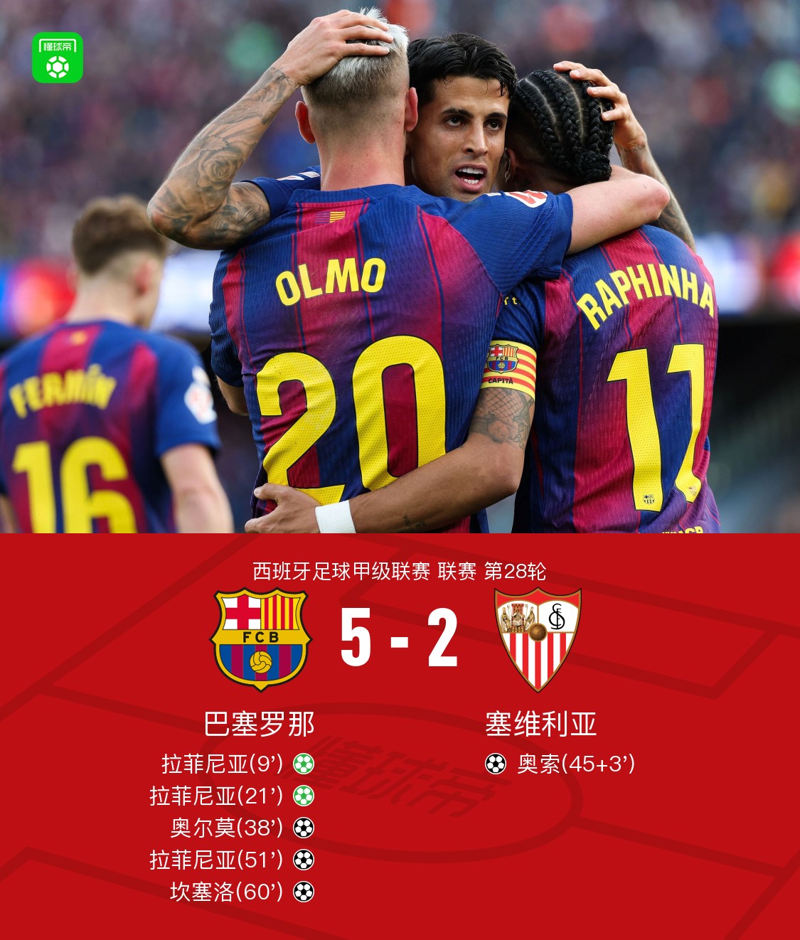 北京时间3月15日西班牙足球甲级联赛 联赛 第28轮,巴塞罗那主场对阵塞维利亚。巴塞罗那拉菲尼亚帽子戏法,奥尔莫破门,坎塞洛破门。塞维利亚奥索破门。最终比分巴萨 5–2 塞维利亚。