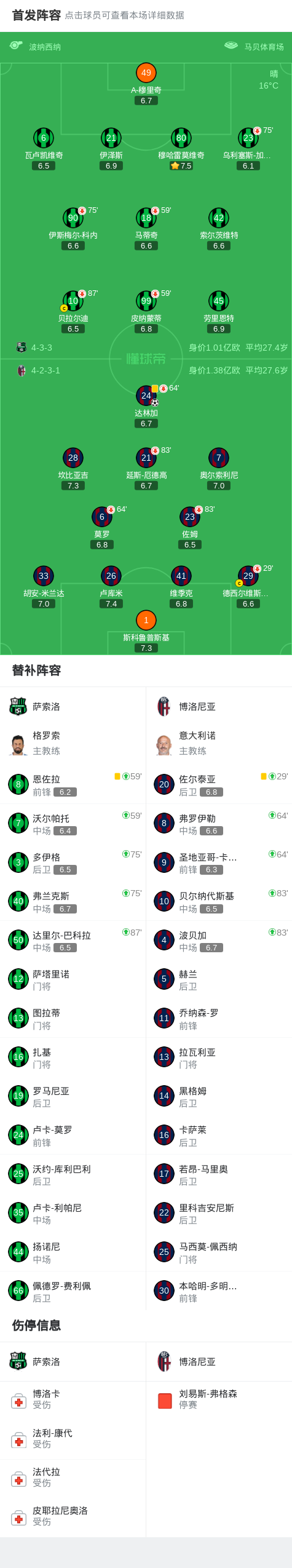 北京时间3月15日意大利足球顶级联赛第29轮,萨索洛主场迎战博洛尼亚。比赛中博洛尼亚球员达林加打入制胜进球,最终萨索洛0-1不敌博洛尼亚。 点击查看本场比赛详细数据>> 点击查看意甲完整积分榜>> 精彩瞬间 第6分钟,博洛尼亚球员达林加打入一球。 球队阵容 技术统计 文章导航 剑南春丨曼联3-1维拉,B费两助攻,卡塞米罗、谢什科破门 比萨3-1卡利亚里,卡拉乔洛两球,莫雷奥点射