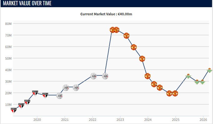 这位巴西边锋的巅峰身价是2022年9月的7500万欧元,那年夏窗,他以9500万欧元的转会费从阿贾克斯转会曼联,不过自那之后,由于表现不佳,他的身价一直在下跌,在曼联时曾跌到了2000万欧