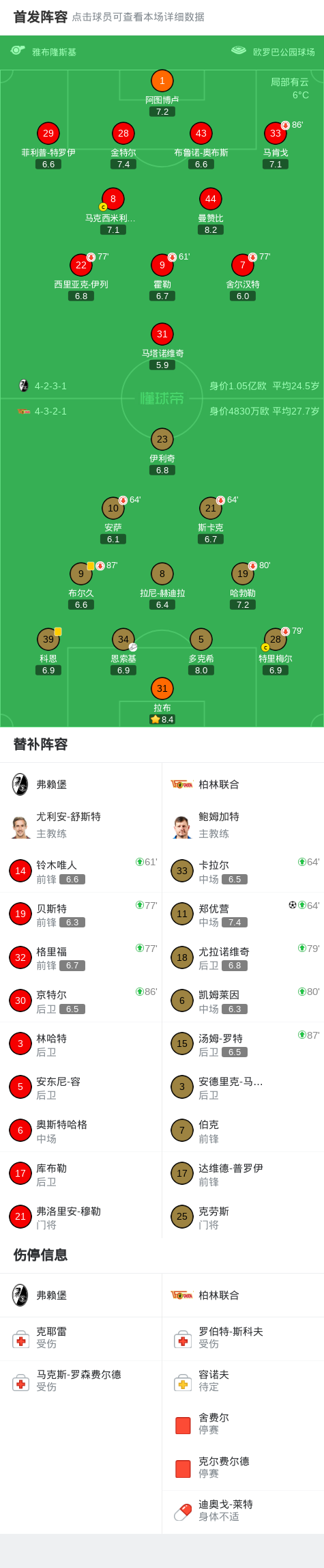 北京时间3月16日德国足球顶级联赛 联赛 第26轮,弗赖堡主场对阵柏林联合。柏林联合郑优营破门。最终比分弗赖堡 0–1 柏林联合。 点击查看本场比赛详细数据>> 点击查看德甲完整积分榜>> 精彩瞬间 下半场补时第2分钟,柏林联合球员恩索基助攻郑优营打入一球。 球队阵容 技术统计 文章导航 利物浦本赛季英超第90分钟及以后已丢8球,为队史单赛季最多 里沙利松英超客战利物浦已打入5球,仅次于安迪-科尔