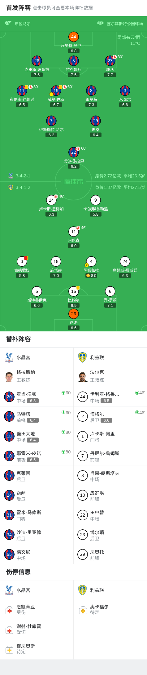 北京时间3月15日英格兰足球顶级联赛 联赛 第30轮,水晶宫主场对阵利兹联。最终比分水晶宫 0–0 利兹联。