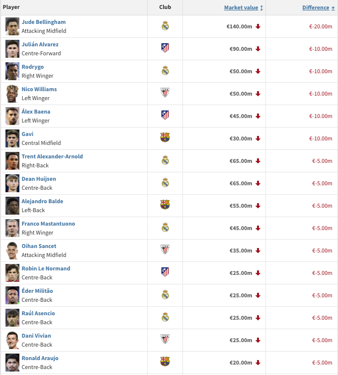 西甲身价跌幅榜:贝林厄姆2000万欧居首,小蜘蛛、罗德里戈、加维1000万欧