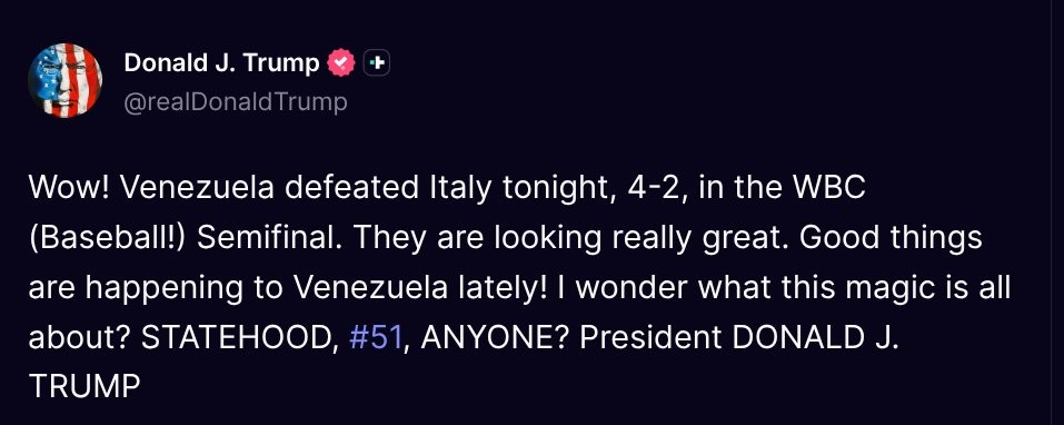美国总统特朗普也在赛后凑了个热闹,他在个人社媒表示:“哇!委内瑞拉今晚在WBC半决赛4-2击败了意大利,他们看起来真的很棒,最近委内瑞拉一直有好事发生,我很好奇这种魔力来自于哪里?让他们成为美国第51个州?有人感兴趣吗?”