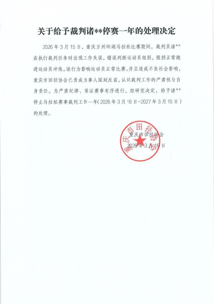 随后,重庆市田协发布处罚公告,重庆万州环湖马拉松裁判被禁赛一年。