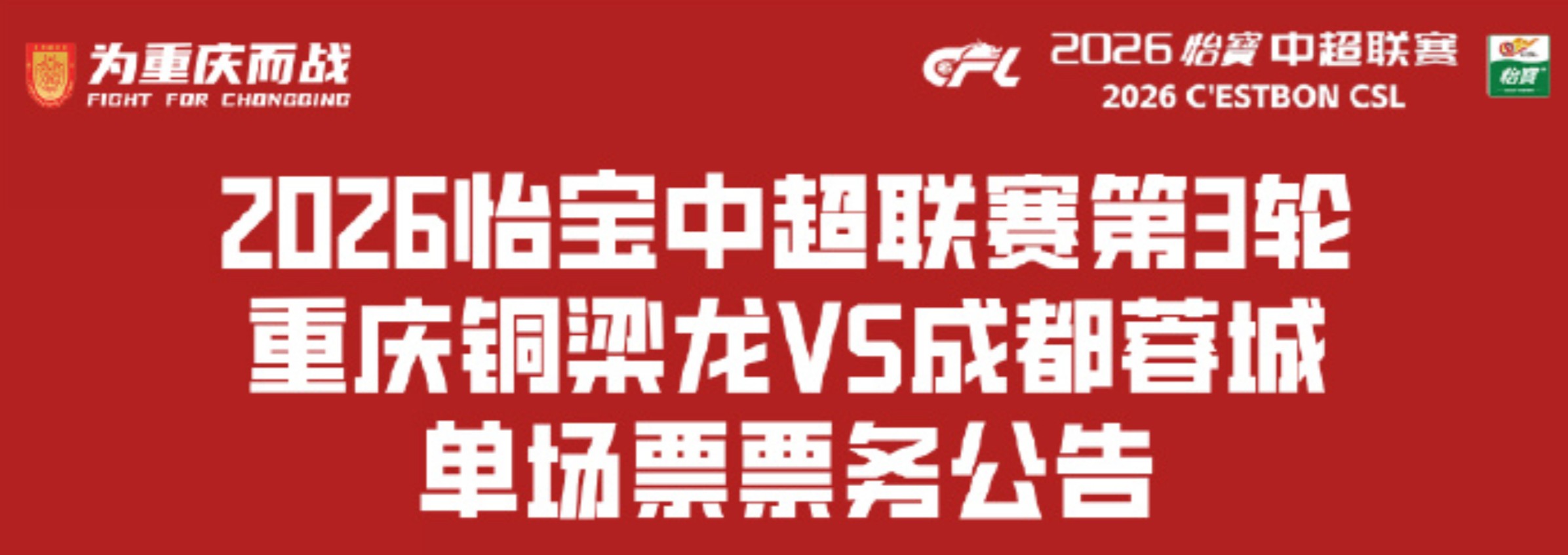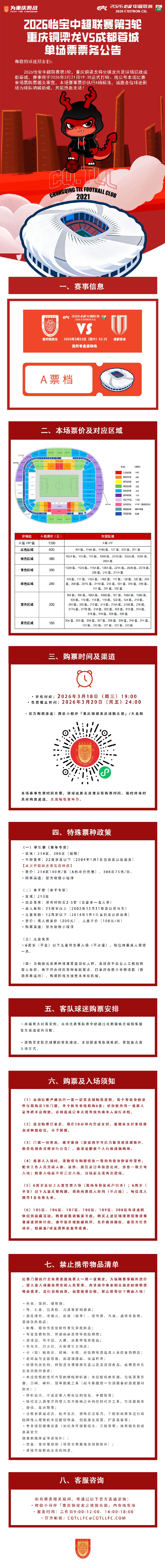 3月17日晚,重庆铜梁龙足球俱乐部公布了第3轮联赛对阵成都蓉城的票务政策。