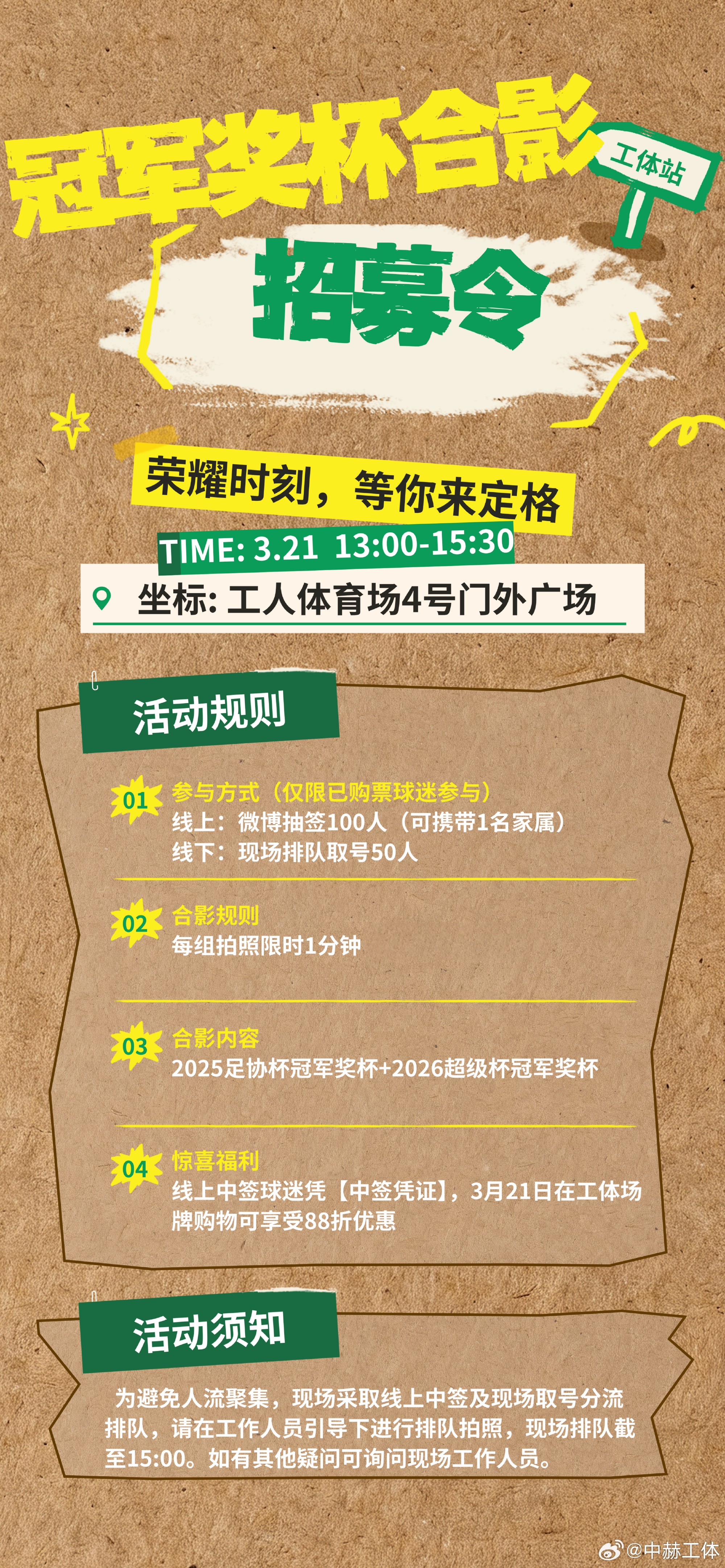 据中赫工体官方消息,京沪德比赛前工体举行奖杯展,已购票球迷可抽取奖杯合影资格。 中赫工体官方写道:“足协杯+超级杯双冠军奖杯同框打卡,已购票球迷速度冲! 关注‘中赫工体’并转发本条微博即可参与【冠军奖杯合影资格】抽签,中签球迷3月21日持中签凭证可至球迷嘉年华现场进行拍摄留念。 活动规则详见海报,如有疑问可后台私信! 中签球迷当日至工体场牌购物可享88折福利!” 北京时间3月21日15:30,北京国安将坐镇主场迎战上海申花。 文章导航 世界波破门,阿森纳官方:埃泽当选对阵勒沃库森一役队内最佳 TA:英超有钱,却在欧冠被其他欧洲豪门甩在身后