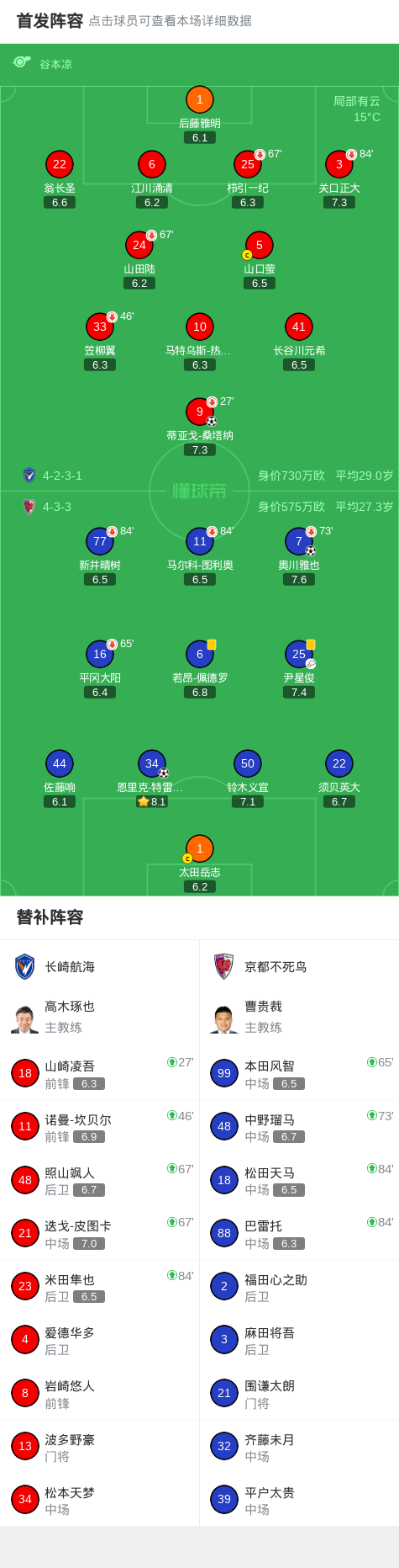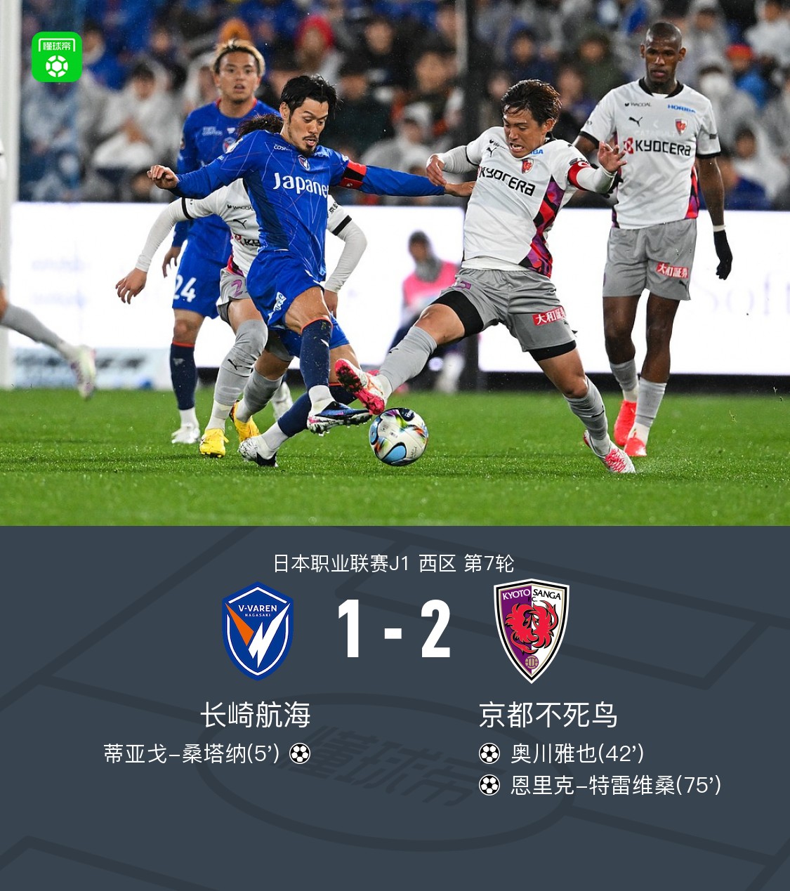 北京时间3月18日日本职业联赛J1西区第7轮,长崎航海主场对阵京都不死鸟。长崎航海蒂亚戈-桑塔纳破门。京都不死鸟奥川雅也、恩里克-特雷维桑分别破门。最终比分长崎航海1–2京都不死鸟。