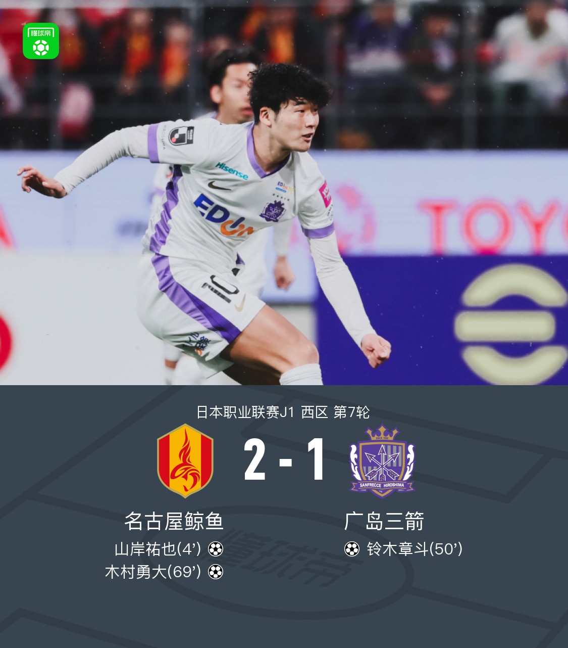 北京时间3月18日日本职业联赛J1西区第7轮,名古屋鲸鱼主场对阵广岛三箭。名古屋鲸鱼山岸祐也、木村勇大分别破门。广岛三箭铃木章斗建功。最终比分名古屋鲸鱼2–1广岛三箭。