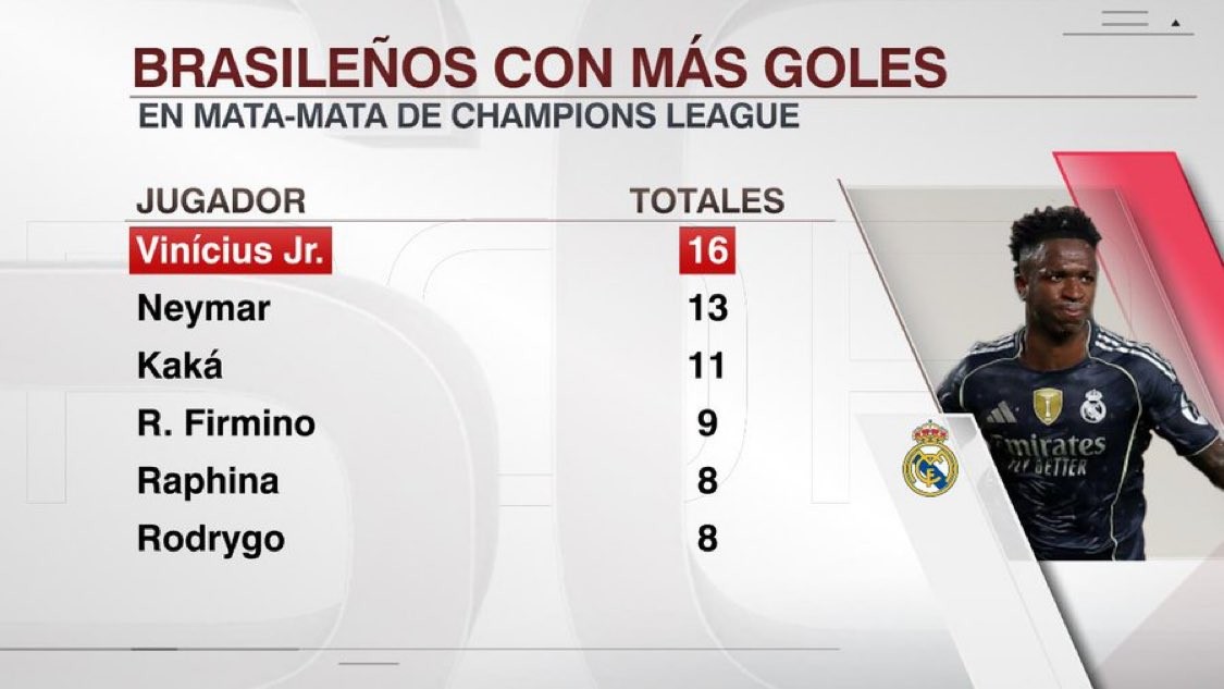 赛后根据统计,算上本场比赛的两粒进球,维尼修斯生涯至今在欧冠淘汰赛中已经打进了16球,在巴西球员欧冠淘汰赛进球榜上他位列第一,领先于内马尔和卡卡。