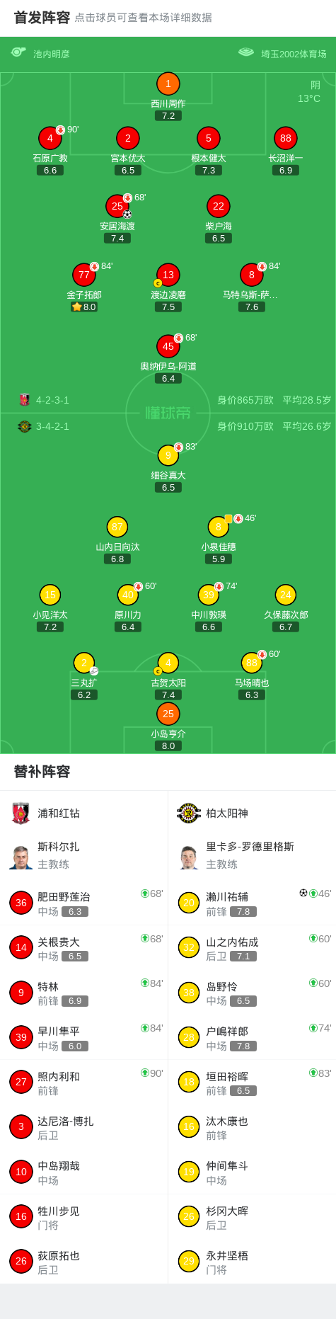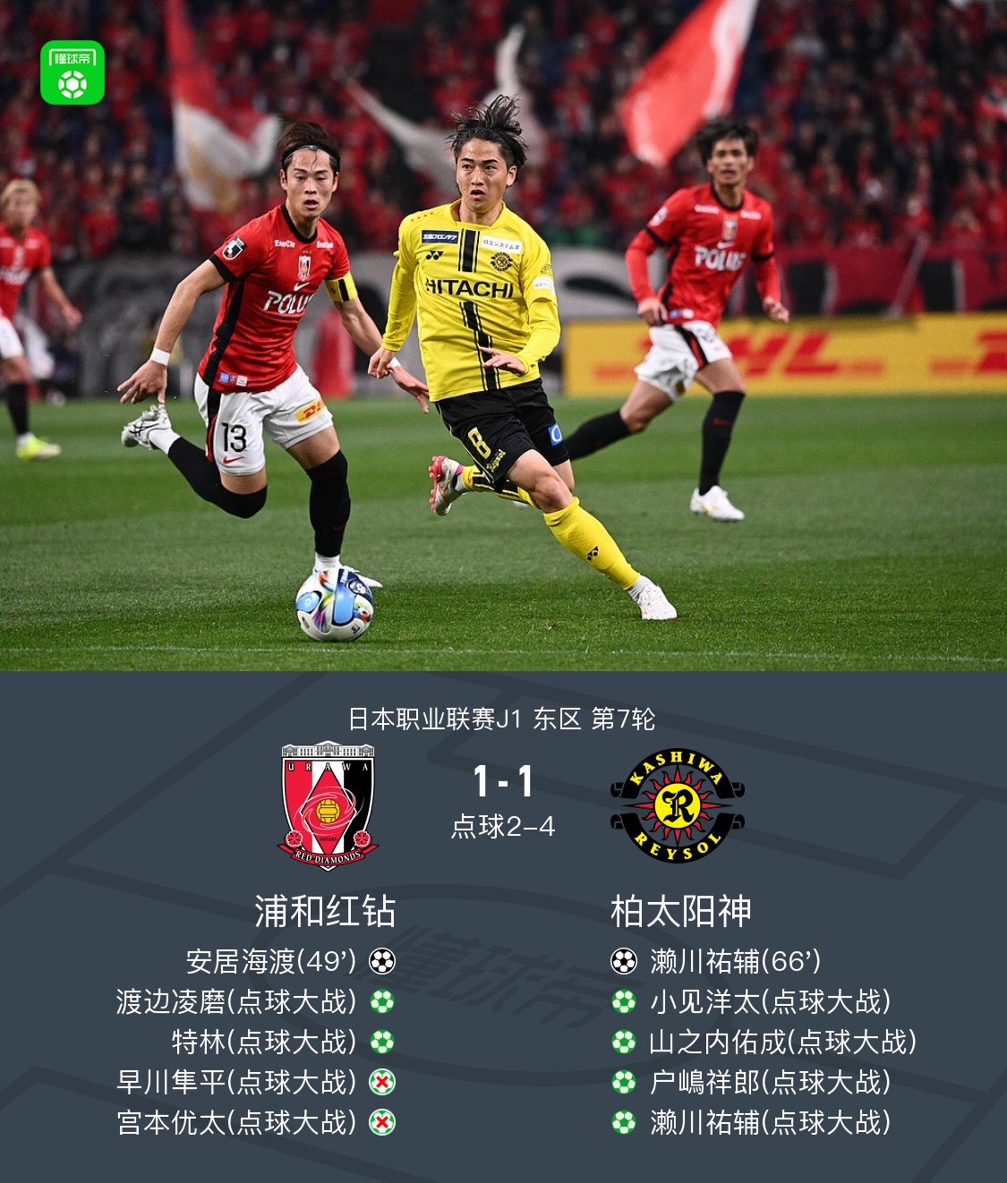 北京时间3月18日日本职业联赛J1 东区 第7轮,浦和红钻主场对阵柏太阳神。浦和红钻安居海渡破门。柏太阳神濑川祐辅破门。最终比分浦和红钻 3–5 柏太阳神。