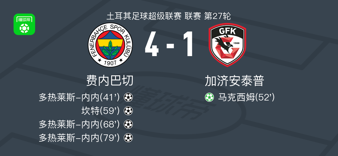 北京时间3月18日土耳其足球超级联赛 联赛 第27轮,费内巴切主场对阵加济安泰普。费内巴切多热莱斯-内内帽子戏法,坎特破门。加济安泰普马克西姆破门。最终比分费内巴切 4–1 加济安泰普。
