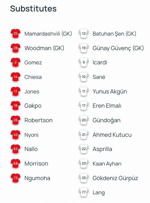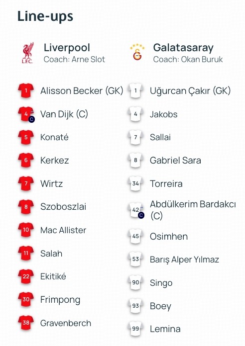 北京时间3月19日凌晨4点,欧冠1/8决赛次回合展开一场焦点战役,利物浦对阵加拉塔萨雷。赛前,双方公布首发阵容。 球员名单 文章导航 拜仁vs亚特兰大:凯恩搭档迪亚斯,乌尔比希、卡尔出战 马卡:西足协取消和埃及的热身赛,目前能约战的对手极其有限
