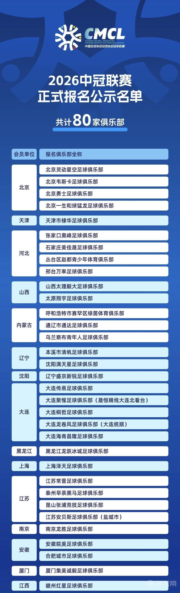 此前,中冠联赛官方公布了2026赛季报名参赛球队的公示信息,一共有80家俱乐部参加今年的中冠比赛。(含候补参赛1家)