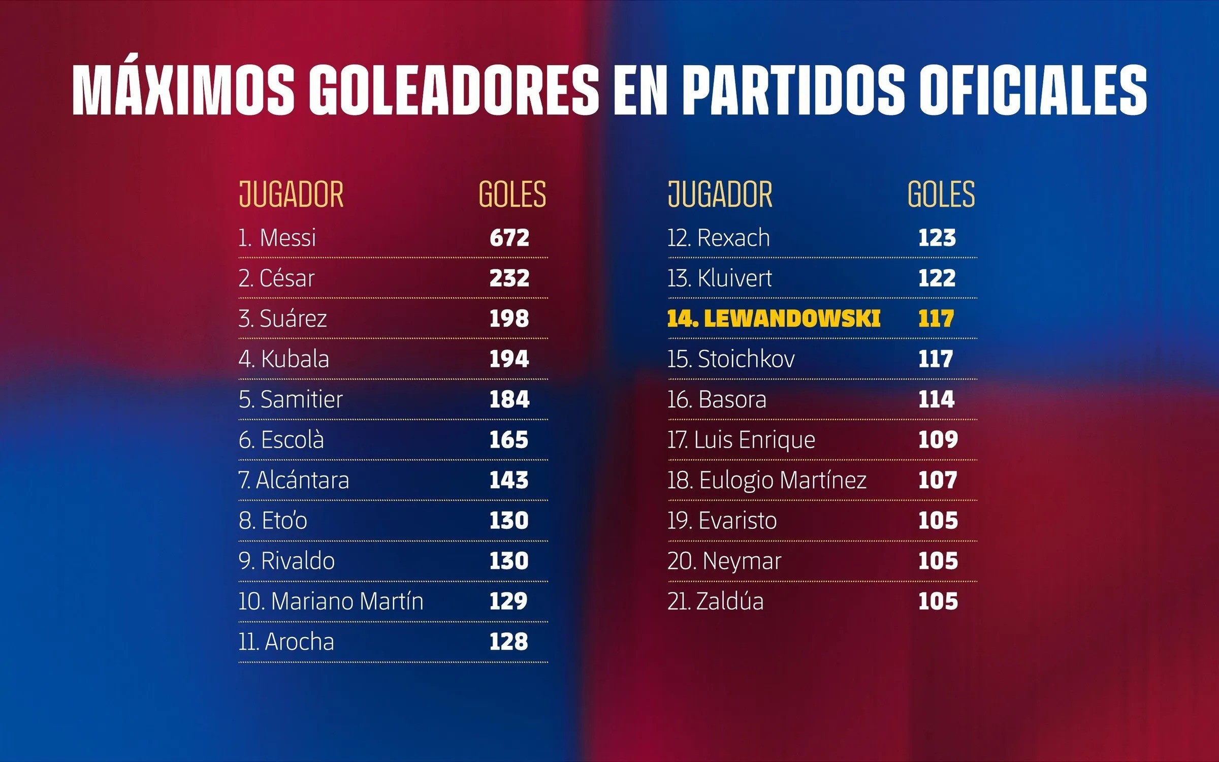 在与纽卡斯尔联的欧冠比赛中上演梅开二度后,莱万以117球追平斯托伊奇科夫,升至巴萨队史射手榜第14位。
