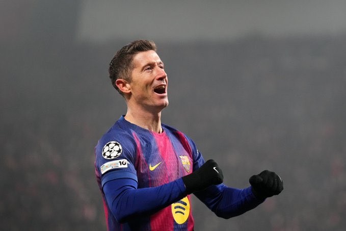 欧冠1/8决赛次回合,巴塞罗那主场对阵纽卡斯尔联,莱万在下半场打入两球,据统计,莱万成为欧冠上演梅开二度最年长的球员。