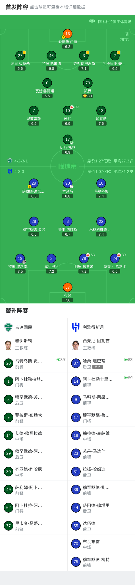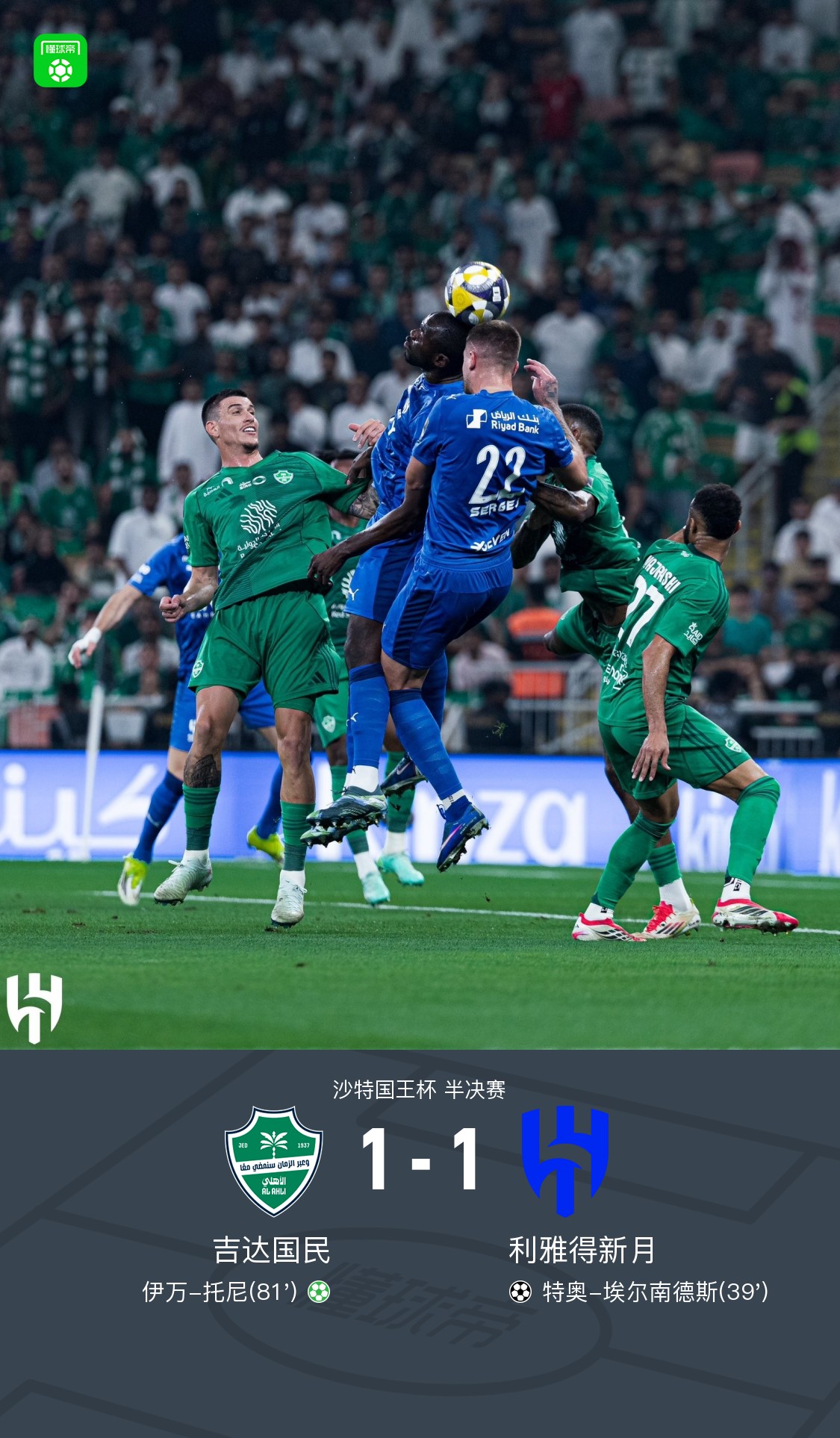 北京时间3月19日沙特国王杯 半决赛,吉达国民对阵利雅得新月。吉达国民伊万-托尼破门。利雅得新月特奥-埃尔南德斯破门。最终比分吉达国民 1–1 利雅得新月。