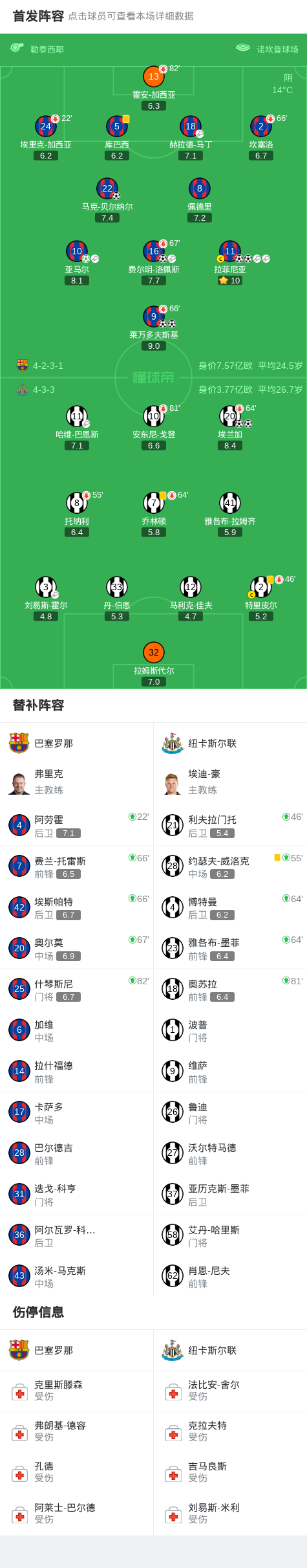 北京时间3月19日1:45,欧冠1/8决赛次回合,巴塞罗那坐镇Spotify诺坎普球场迎战纽卡斯尔联,本场主裁判为勒泰西耶,首回合双方1-1战平。上半场,两队上演进球大战,巴萨这边拉菲尼亚破门+造点,贝尔纳尔、亚马尔建功,纽卡方面埃兰加梅开二度。下半场,费尔明破门,莱万连下两城梅开二度,拉菲尼亚两送助攻后再入一球,托纳利、霍安-加西亚伤退。最终,巴萨主场7-2狂胜纽卡,总比分8-3晋级。