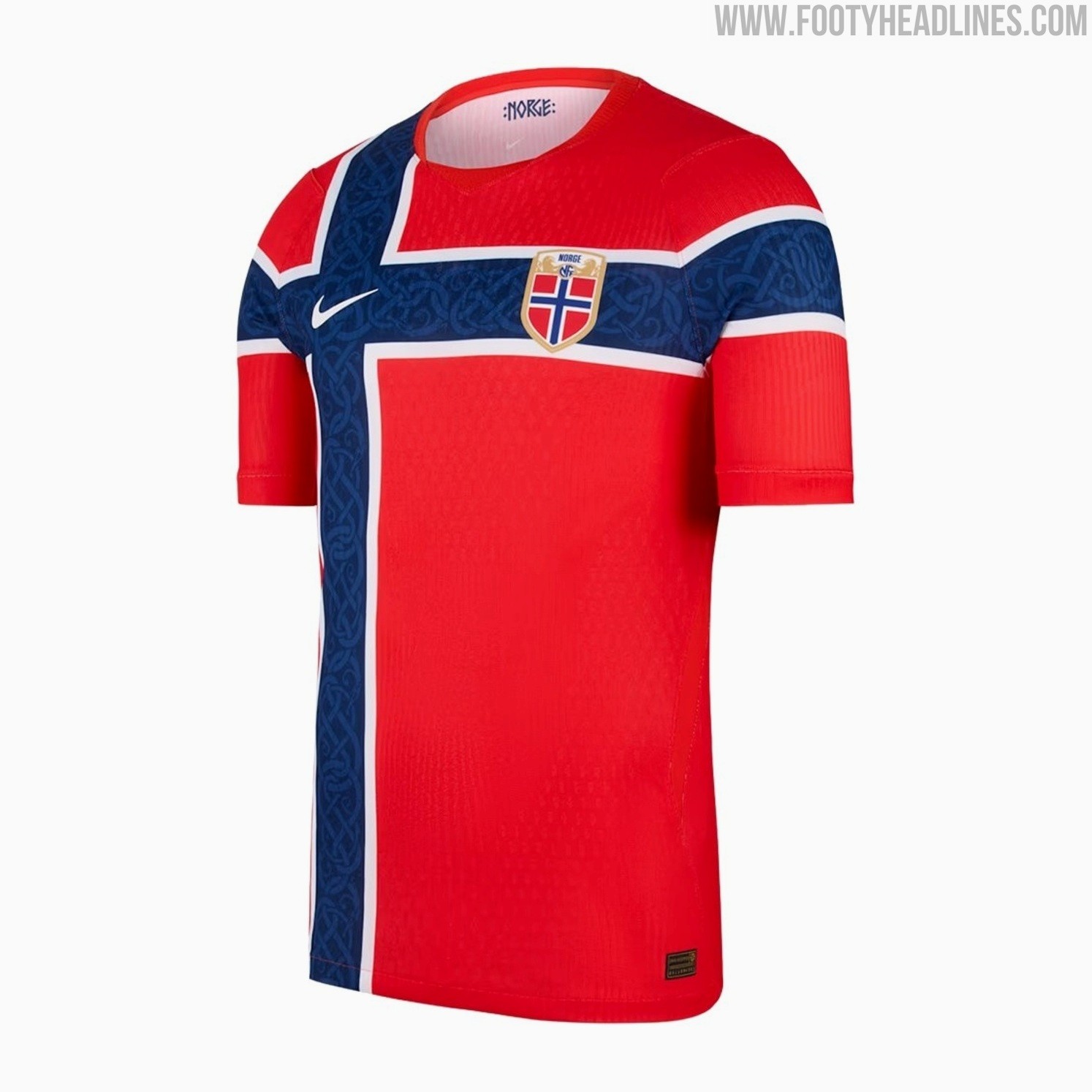 挪威 2026 年主场球衣由耐克制造,以传统的红色为底色,饰以醒目的海军蓝十字,十字轮廓为白色,这款十字设计是为了致敬 1997 年由茵宝 (Umbro) 制造的主场球衣。