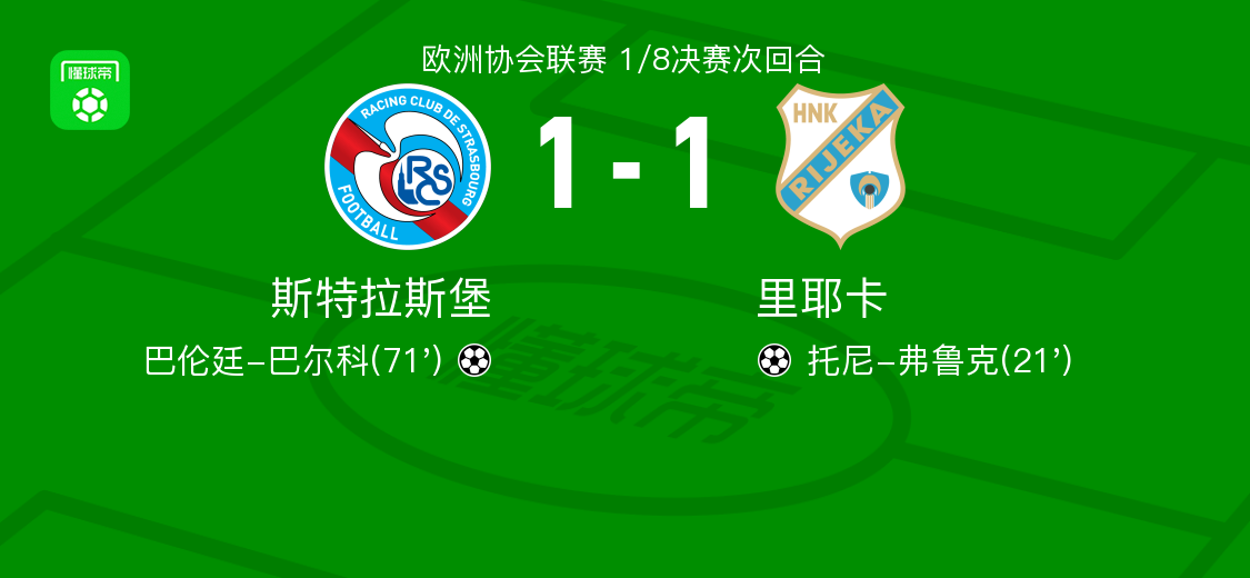 北京时间3月20日欧洲协会联赛 1/8决赛次回合,斯特拉斯堡对阵里耶卡。斯特拉斯堡巴伦廷-巴尔科破门。里耶卡托尼-弗鲁克破门。最终比分斯特拉斯堡 1–1 里耶卡。两回合总比分斯特拉斯堡3-2里耶卡。