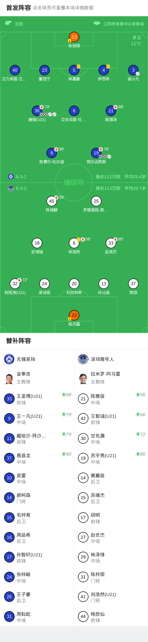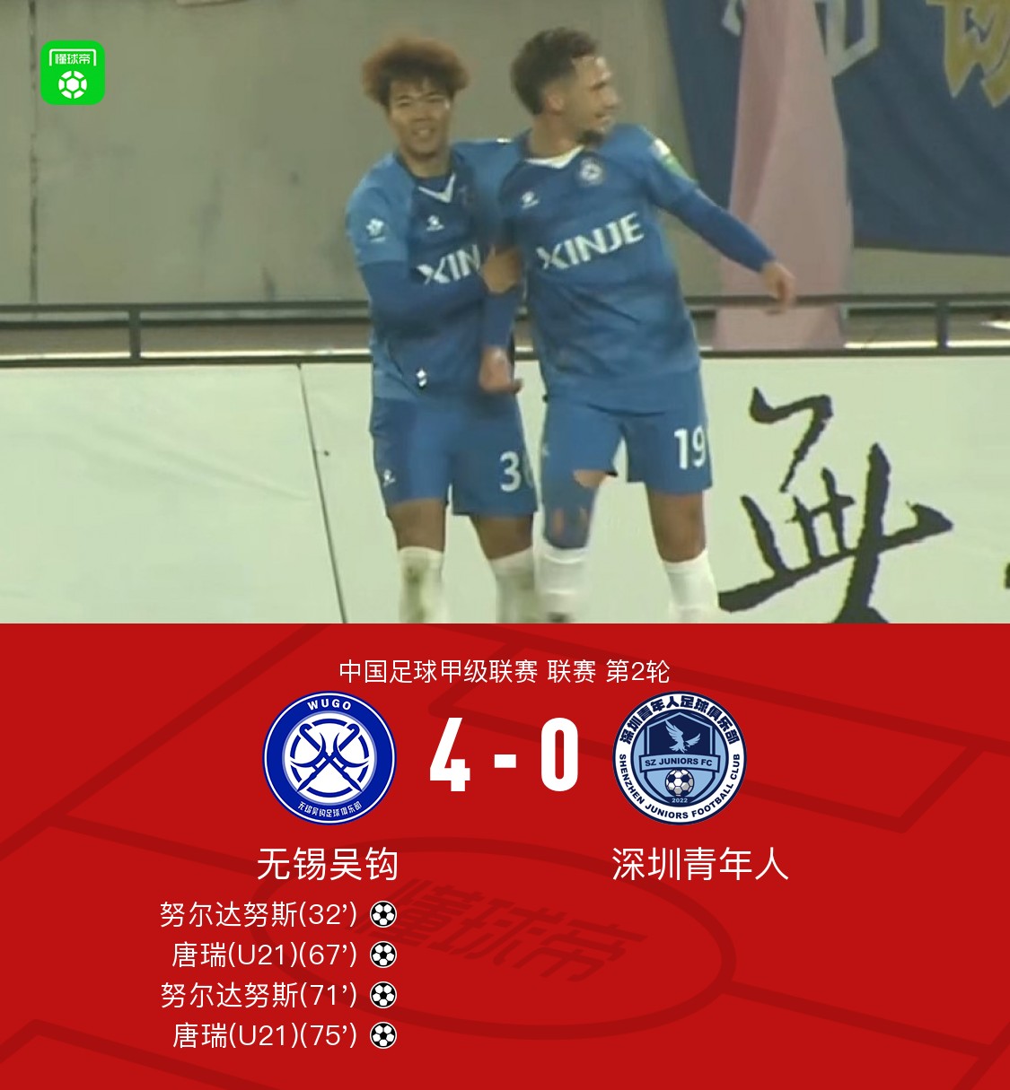 北京时间3月20日中国足球甲级联赛 联赛 第2轮,无锡吴钩主场对阵深圳青年人。无锡吴钩努尔达努斯梅开二度,唐瑞梅开二度。最终比分无锡吴钩 4–0 深圳青年人。