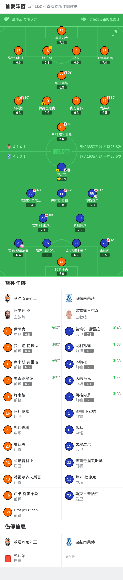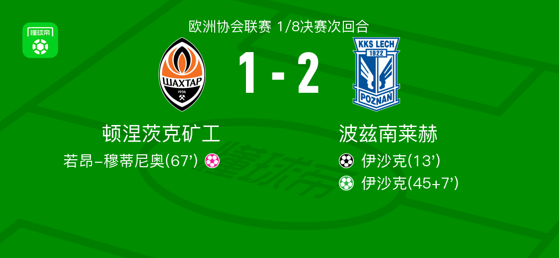北京时间3月20日欧洲协会联赛 1/8决赛次回合,顿涅茨克矿工对阵波兹南莱赫。波兹南莱赫伊沙克梅开二度,若昂-穆蒂尼奥自摆乌龙。最终比分顿涅茨克矿工 1–2 波兹南莱赫。两回合总比分顿涅茨克矿工4-3波兹南莱赫。