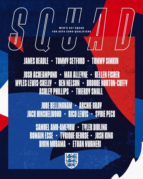 北京时间3月20日,英格兰队官方公布了本月国际比赛日U21队的大名单,其中斯凯利、乔布-贝林厄姆、阿奇-格雷、里科-刘易斯、恩瓦内里等球员在列。