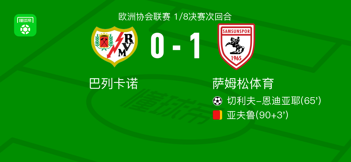 北京时间3月20日欧洲协会联赛 1/8决赛次回合,巴列卡诺对阵萨姆松体育。萨姆松体育切利夫-恩迪亚耶破门。最终比分巴列卡诺 0–1 萨姆松体育。两回合总比分巴列卡诺3-2萨姆松体育。