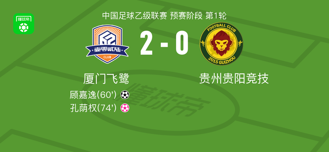 北京时间3月21日中国足球乙级联赛 预赛阶段 第1轮,厦门飞鹭主场对阵贵州贵阳竞技。厦门飞鹭顾嘉逸破门。贵州贵阳竞技孔荫权自摆乌龙。最终比分厦门飞鹭 2–0 贵州贵阳竞技。