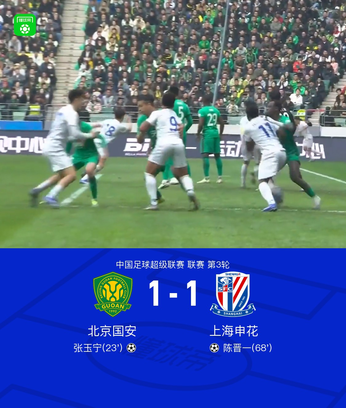 北京时间3月21日中国足球超级联赛 联赛 第3轮,北京国安主场对阵上海申花。北京国安张玉宁破门。上海申花陈晋一破门。最终比分北京国安 1–1 上海申花。