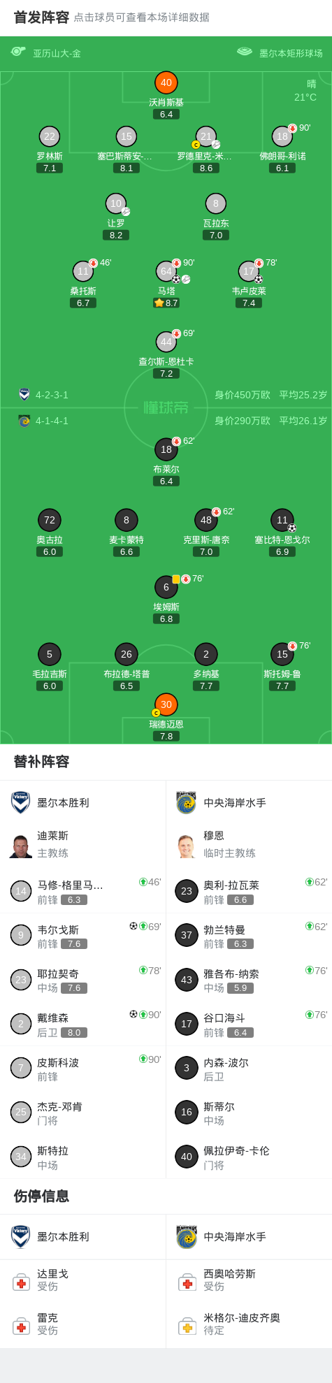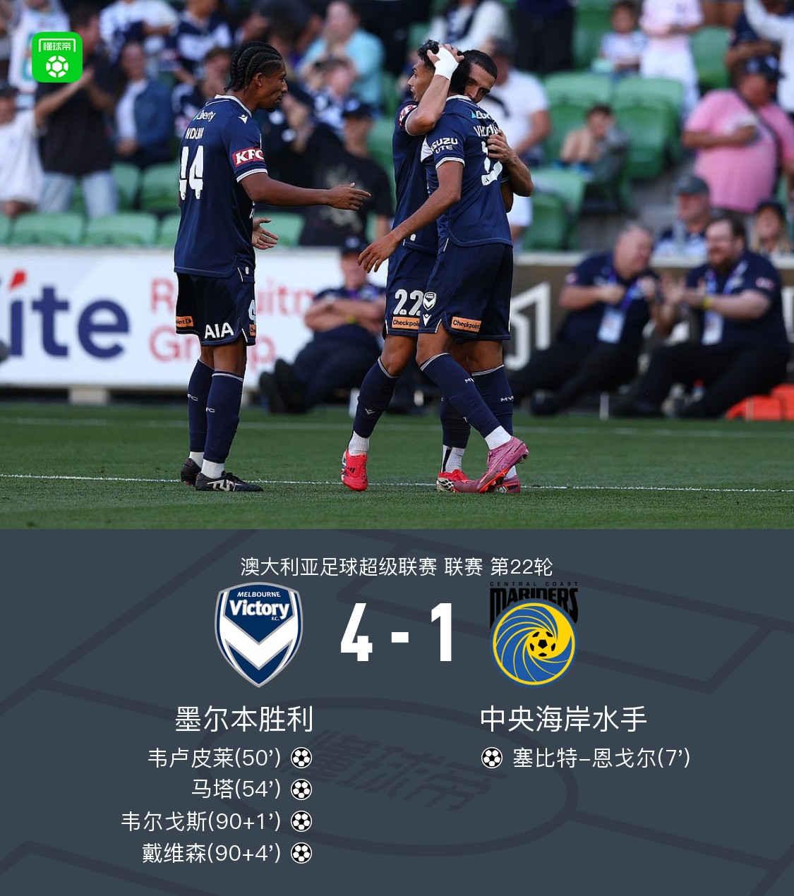 北京时间3月21日澳大利亚足球超级联赛第22轮,墨尔本胜利主场对阵中央海岸水手。比赛中,中央海岸水手率先取得进球;随后墨尔本胜利连入四球,韦卢皮莱、马塔、韦尔戈斯、戴维森先后完成破门,其中马塔贡献一次助攻,另有队友完成关键传球。最终比分墨尔本胜利4-1中央海岸水手。