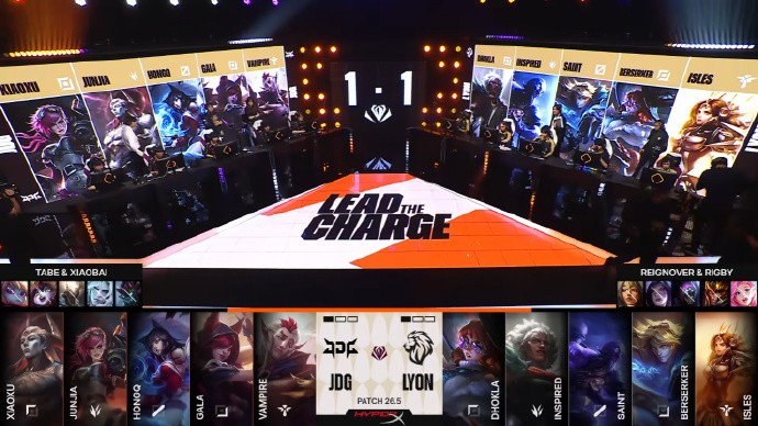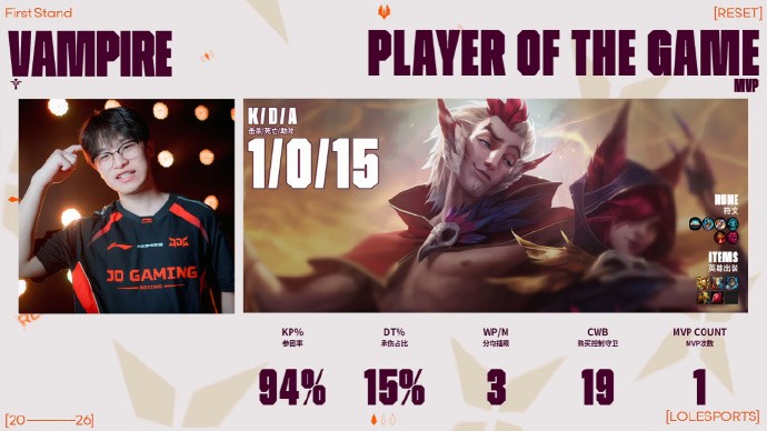 北京时间3月21日,2026全球先锋赛第六日,JDG 3-1淘汰LYON晋级淘汰赛,半决赛中将迎来LPL赛区内战,JDG将对阵BLG。