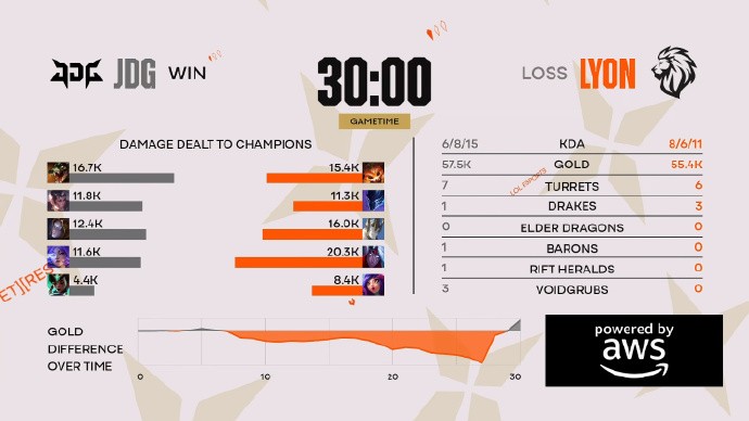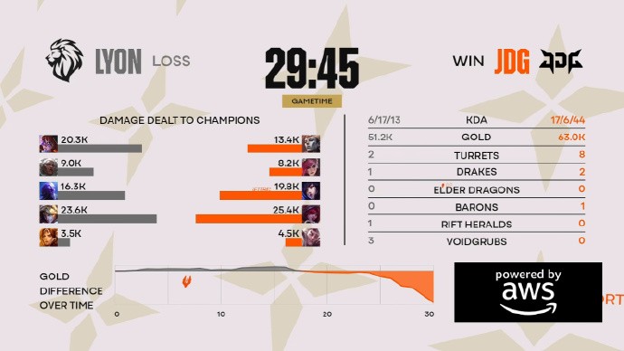 第29分钟,LYON中路三人集火鳄鱼,双方一换一,随后JDG四人推进至高地,赢下团战后果断推平基地翻盘成功!