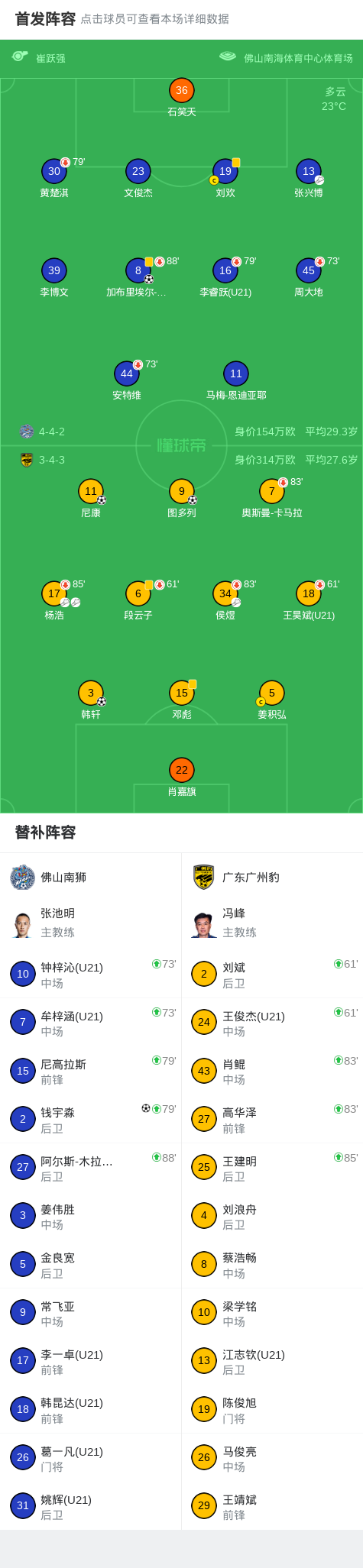 北京时间3月21日中国足球甲级联赛 联赛 第2轮,佛山南狮主场对阵广东广州豹。佛山南狮加布里埃尔-比斯波破门,钱宇淼破门。广东广州豹尼康破门,韩轩破门,图多列破门。最终比分佛山南狮 2–3 广东广州豹。