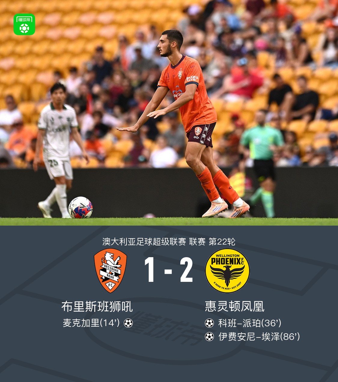 北京时间3月21日澳大利亚足球超级联赛第22轮,布里斯班狮吼主场对阵惠灵顿凤凰。上半场麦克加里角球直接破门,之后休斯头球摆渡,派珀头球接力破门。下半场史密斯直塞,埃泽单刀破门绝杀。最终惠灵顿凤凰2-1逆转布里斯班狮吼。