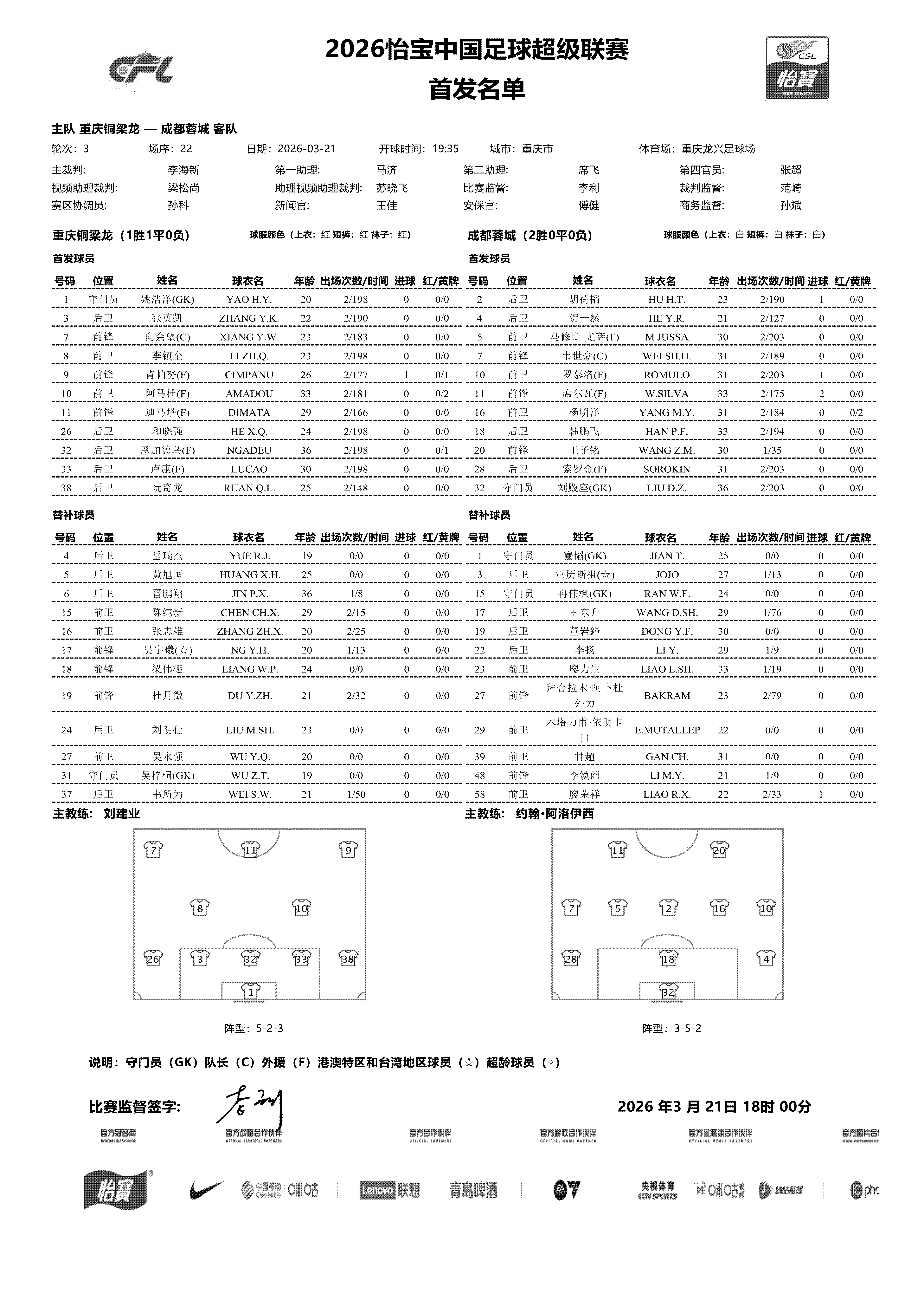 北京时间3月21日19:35,中超联赛第三轮,重庆铜梁龙坐镇主场迎战成都蓉城,本场比赛主裁判是李海新,VAR是梁松尚,赛前双方公布首发: