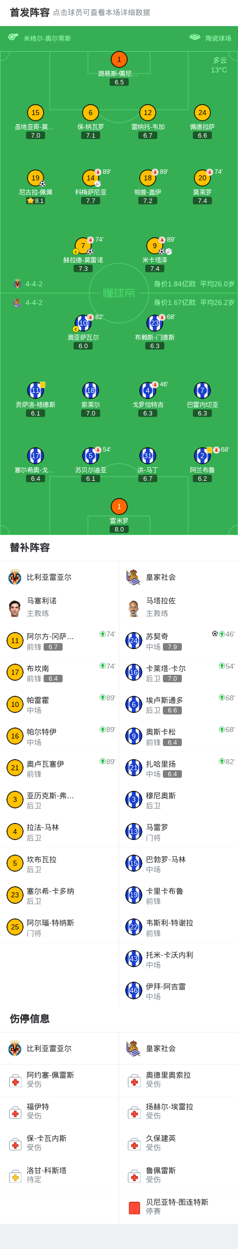 北京时间3月21日西班牙足球甲级联赛 联赛 第29轮,比利亚雷亚尔主场对阵皇家社会。比利亚雷亚尔赫拉德-莫雷诺破门,米卡塔泽破门,尼古拉-佩佩破门。皇家社会苏契奇破门。最终比分比利亚雷亚尔 31 皇家社会。