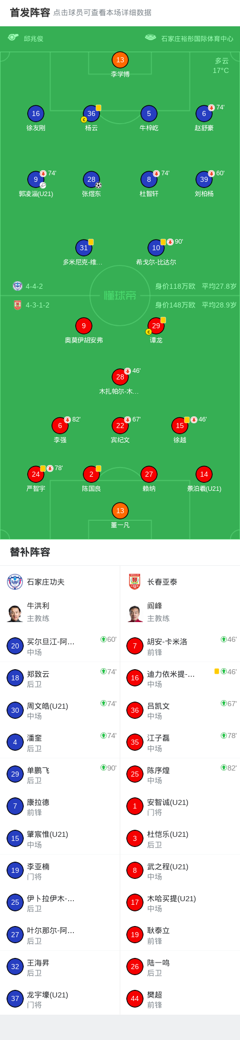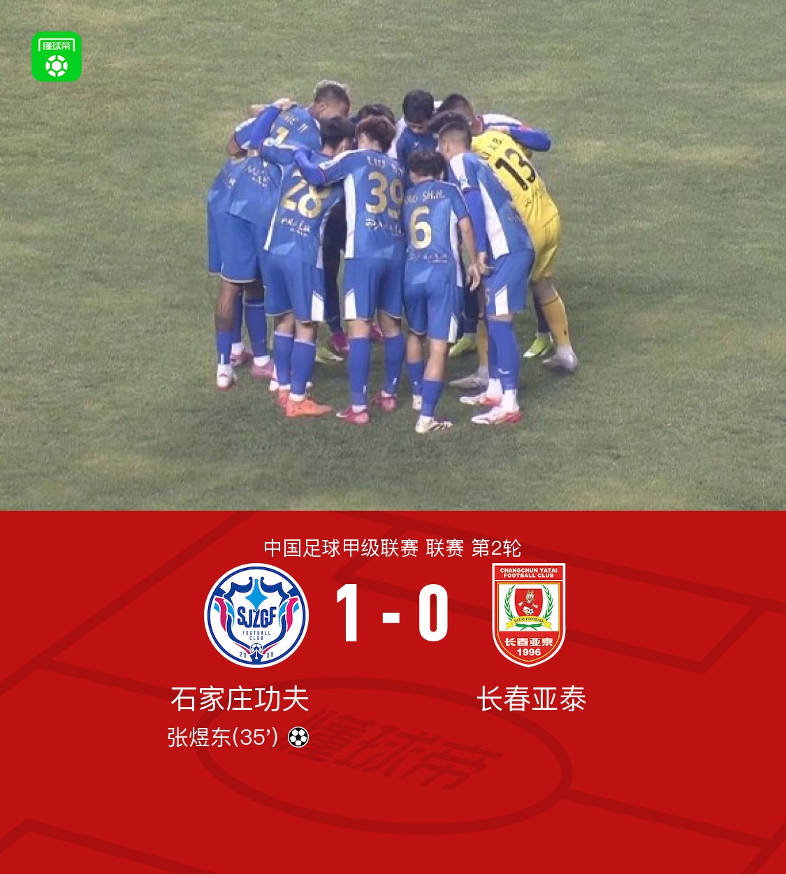 北京时间3月21日中国足球甲级联赛 联赛 第2轮,石家庄功夫主场对阵长春亚泰。石家庄功夫张煜东破门。最终比分石家庄功夫 1–0 长春亚泰。