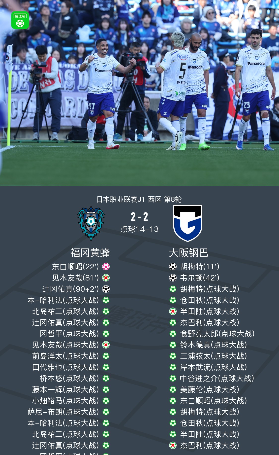 北京时间3月21日,日本职业联赛J1西区第8轮,福冈黄蜂主场对阵大阪钢巴。上半场,胡梅特首开记录,东口顺昭不慎自摆乌龙,韦尔顿抓住小畑裕马低级失误破门。下半场,见木友哉主罚点球被东口顺昭扑出,辻冈佑真绝平,双方战成2-2。点球大战中,小畑裕马两度扑点,见木友哉踢飞,福冈黄蜂14-13取胜。