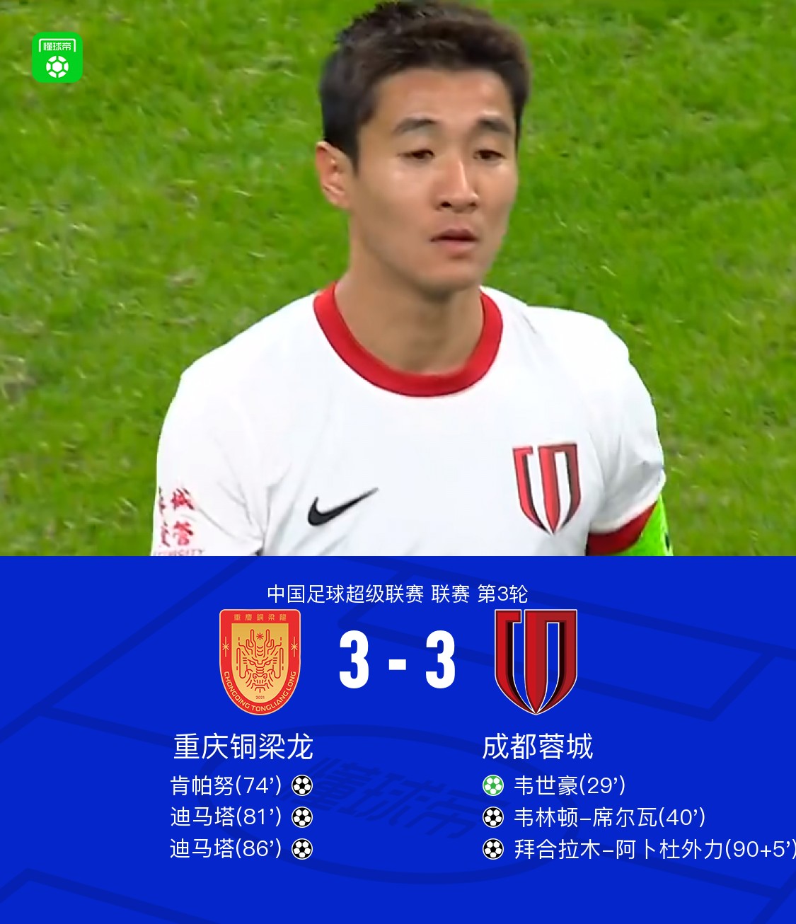 北京时间3月21日中国足球超级联赛 联赛 第3轮,重庆铜梁龙主场对阵成都蓉城。重庆铜梁龙肯帕努破门,迪马塔梅开二度。成都蓉城韦世豪破门,韦林顿-席尔瓦破门,拜合拉木-阿卜杜外力破门。最终比分重庆铜梁龙 3–3 成都蓉城。