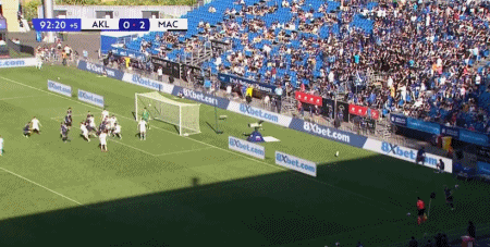 第90+3分钟,德弗里斯角球开出,赖克头球破门扳回一分,奥克兰1-2