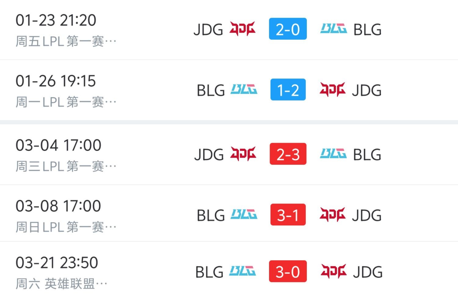 在组内赛的前两次相遇中,JDG均战胜了BLG,比分是2-0和2-1。来到季后赛胜者组决赛,BLG鏖战五局3-2战胜了JDG,随后在决赛中3-1再胜JDG。在先锋赛半决赛中,两队再次相遇,这一回的比分直接变成了BLG3-0JDG。