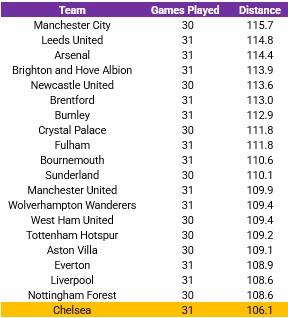 切尔西本赛季已经完成31场英超比赛,场均跑动距离为106.1公里,为英超倒数第一,距离排行榜榜首的曼城差距为9.6公里,几乎相当于一名球员的全场跑动距离。