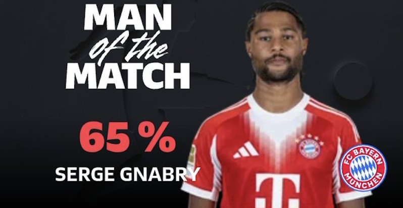 德甲第27轮,拜仁慕尼黑主场4-0大胜柏林联合,此役上演梅开二度的拜仁前锋格纳布里当选德甲官方全场最佳球员。