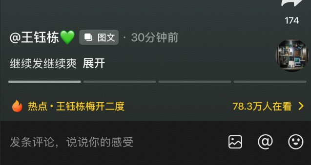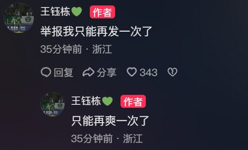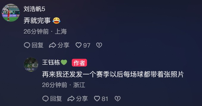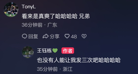 北京时间3月22日,浙江球员王钰栋在抖音再次晒出了对阵青岛海牛时进球的庆祝照,并配文“继续发继续爽”。这次王钰栋在照片中把海牛球迷做了打码处理。