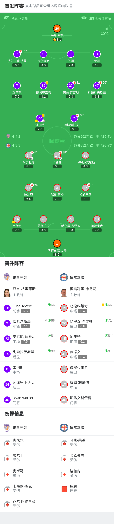 北京时间3月22日澳大利亚足球超级联赛 联赛 第22轮,珀斯光荣主场对阵墨尔本城。上半场阿尔扎尼禁区内领球后破门。下半场补时阶段库哈尔斯基传中,塔加特绝平。最终珀斯光荣1-1战平墨尔本城。