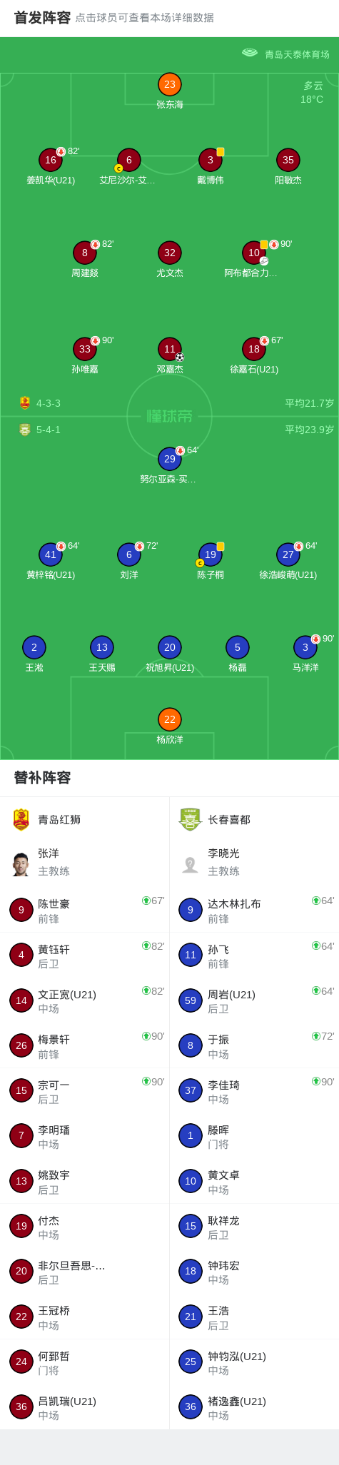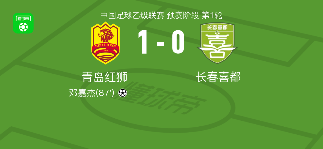 北京时间3月22日中国足球乙级联赛 预赛阶段 第1轮,青岛红狮主场对阵长春喜都。青岛红狮邓嘉杰破门。最终比分青岛红狮 1–0 长春喜都。 点击查看本场比赛详细数据>> 点击查看中乙完整积分榜>> 精彩瞬间 第87分钟,青岛红狮球员阿布都合力力-吾斯曼江助攻邓嘉杰打入一球。 球队阵容 文章导航 海港B队6-1十人上海赛更达,李圣龙、温钧翔双响,杨黔东破门 成都蓉城B队1-0温州,姚子轩打进全场唯一进球
