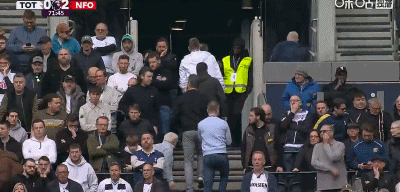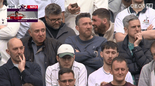 第62分钟,0-2落后保级形势严峻,现场热刺球迷面无表情陷入无语