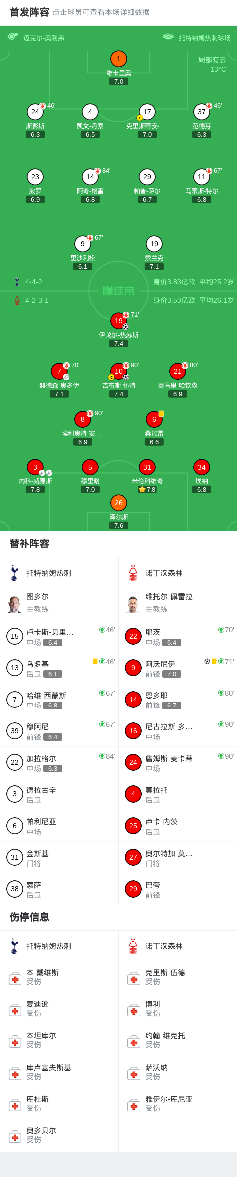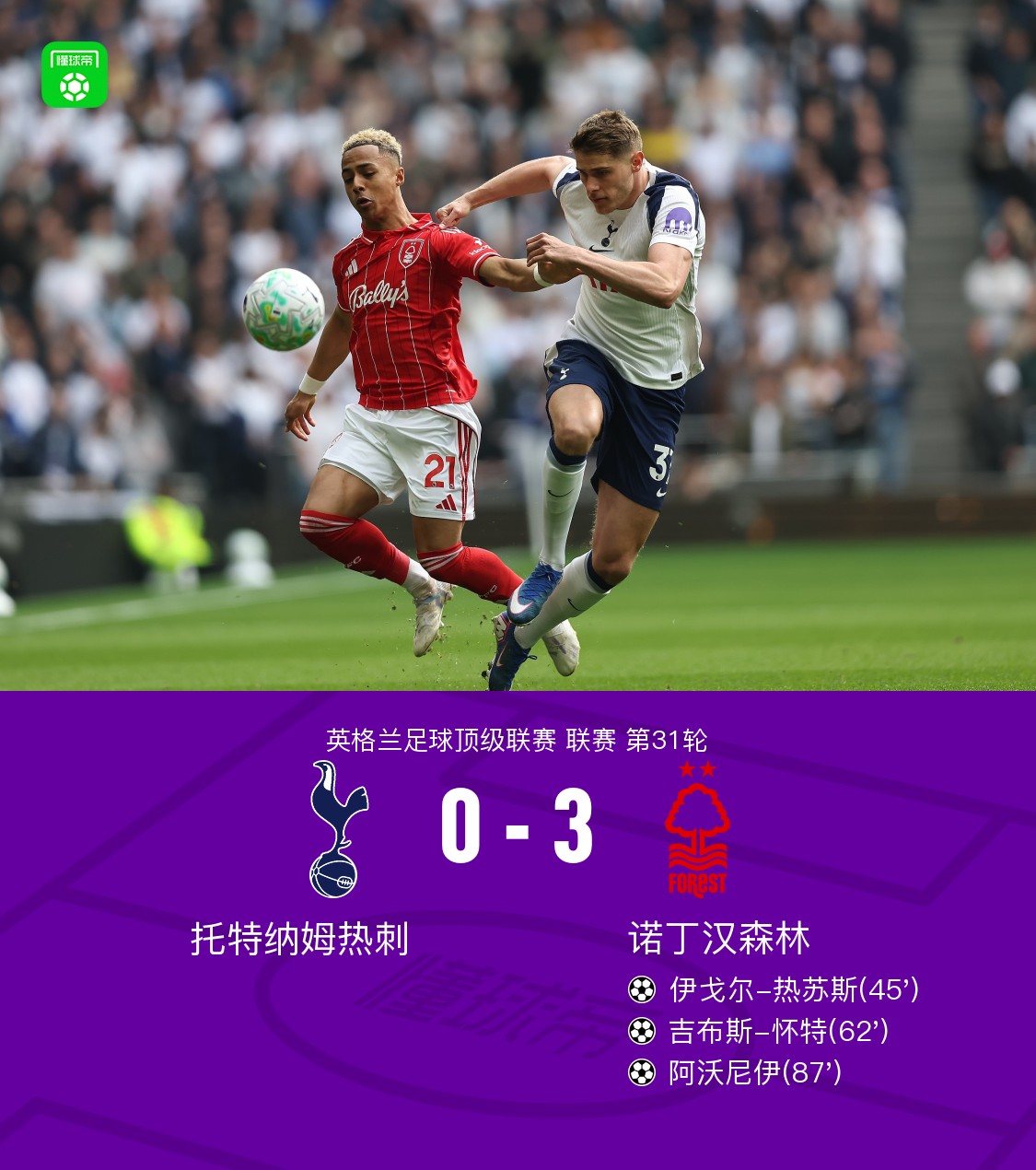 北京时间3月22日英格兰足球顶级联赛 第31轮,托特纳姆热刺主场对阵诺丁汉森林。上半场,威廉斯角球开出,热苏斯头球破门。下半场,怀特、阿沃尼伊相继破门,锁定胜局。最终比分热刺 0–3 诺丁汉森林。