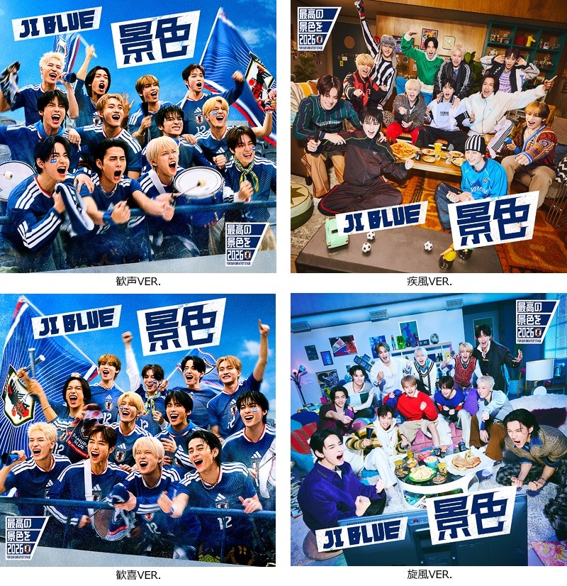 此外,该单曲将以全部16种形态(欢呼版/疾风版/狂喜版/旋风版/粉丝俱乐部限定盘12种)发布。其中欢呼版与狂喜版的封面,以JI BLUE成员身着日本国家队队服在球场应援的场景为灵感设计。粉丝俱乐部限定发售的成员个人单曲封面,采用了拼接后呈现球队圆阵造型的特别设计。