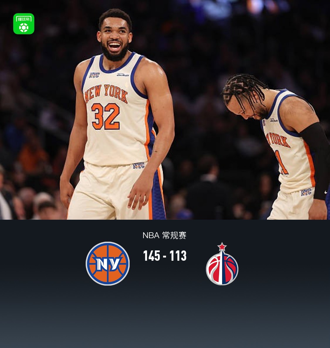 第四节尼克斯科勒克拿下11分,奇才杰登-哈迪拿下11分,最终尼克斯145-113战胜奇才